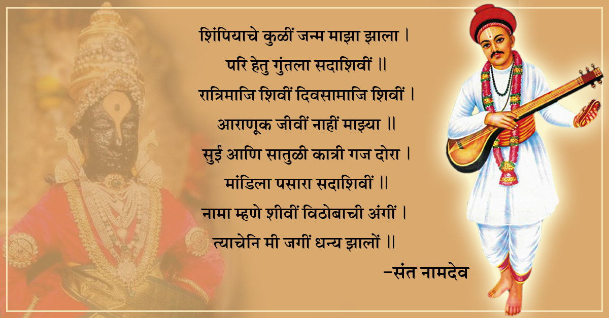 संत नामदेवांचा जन्म शिंप्याच्या घरात झाला आणि आता तर नामदेव शिंपी या नावाने ती पोटजातच त्यांच्या नावावरून ओळखली जाते. नामदेव हे शिंपी म्हणून जन्माला आले असले तरी त्यांनी समाजपुरुषाचे फाटके, तुटके, विटके वस्त्र नीट कसे होईल त्याचीच चिंता वाहिली. नामदेव संत होते, ईश्र्वराचे अनन्यभक्त होते, पण त्याबरोबरच समाजसेवकही होते. समाज-कल्याणाची चिंता वाहणारे होते. नामदेवांच्या चरित्रात केवढी तरी अद्भुतरम्यता आहे. नामदेव आपल्या तरुण वयात दरोडेखोर झाले होते आणि पुढे विरक्ती येऊन संत झाले, अशीही एक कथा आहे. नामदेवांच्या जीवनात पांडुरंग अनेक रूपाने वावरतो. पांडुरंग हा नामदेवांचा सखाच आहे. नामदेवांचा भक्तीवर अपार विश्र्वास आहे. त्यांना भक्त म्हणून जगणे आणि भक्त म्हणूनच स्वतःला ओळखले जाणे, महत्त्वाचे वाटते. त्यांना ब्रह्माची, ब्रह्मज्ञानाची कशाचीही आवश्यकता नाही, अपेक्षा नाही ! ते म्हणतात,