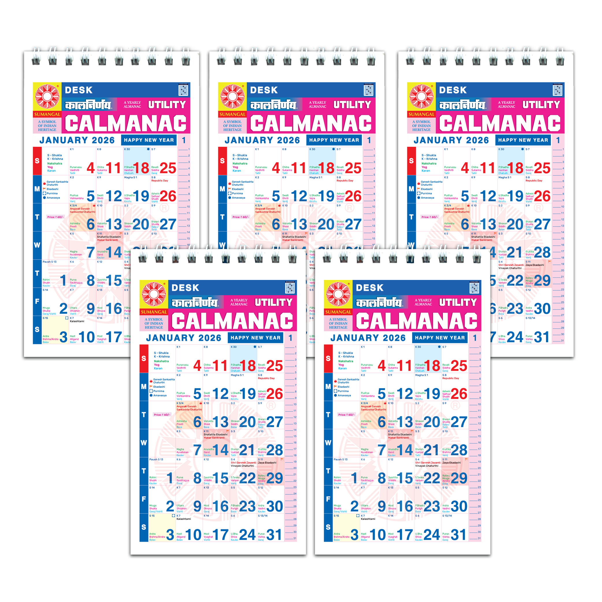 The Kalnirnay English Desk Edition 2026 is designed for use in the office or home desk. It includes all pertinent information about festivals and holidays in one place. The Desk Periodical is also available in Marathi.