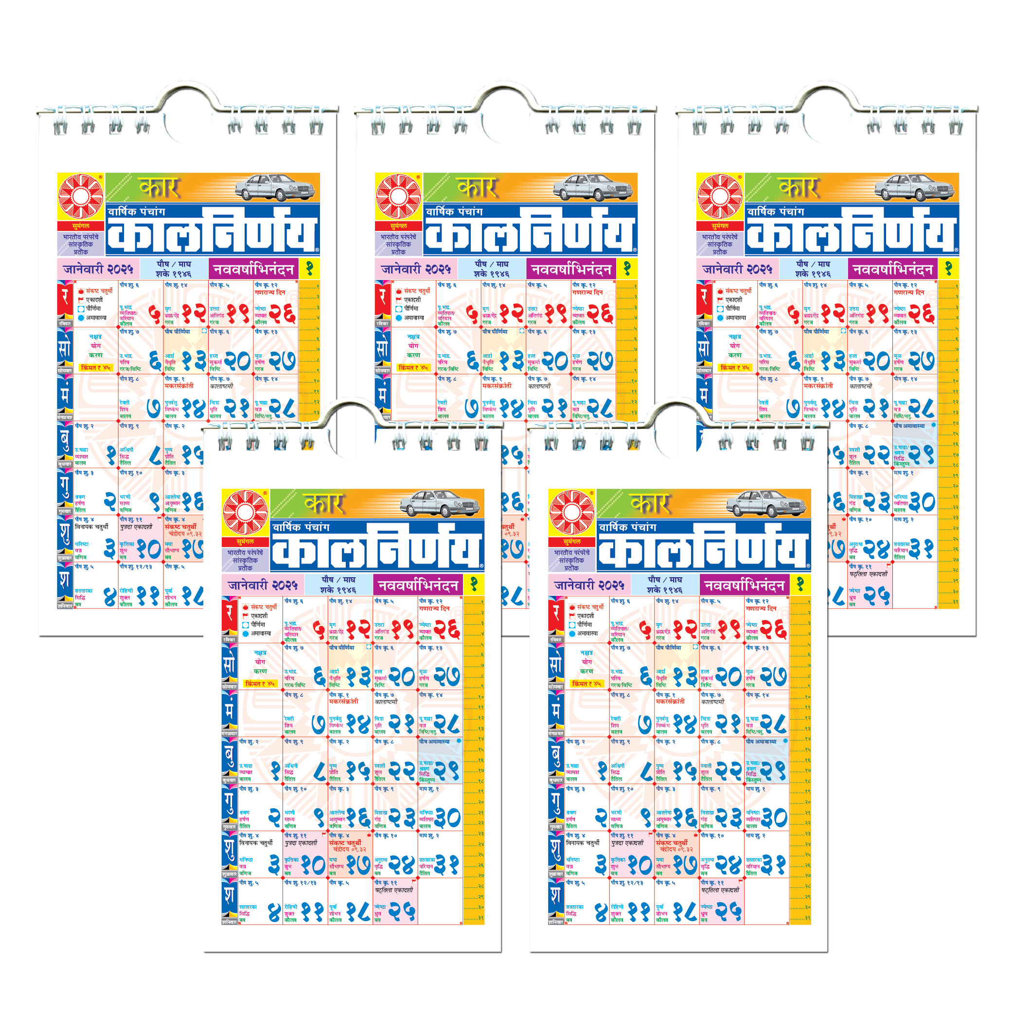 The Kalnirnay Marathi Car Edition for 2026 is specially made to hang in your car. Get all the information you need on holidays, festivals and important events while travelling. This edition is also available in Hindi, English and Gujarati as a pack of 5.