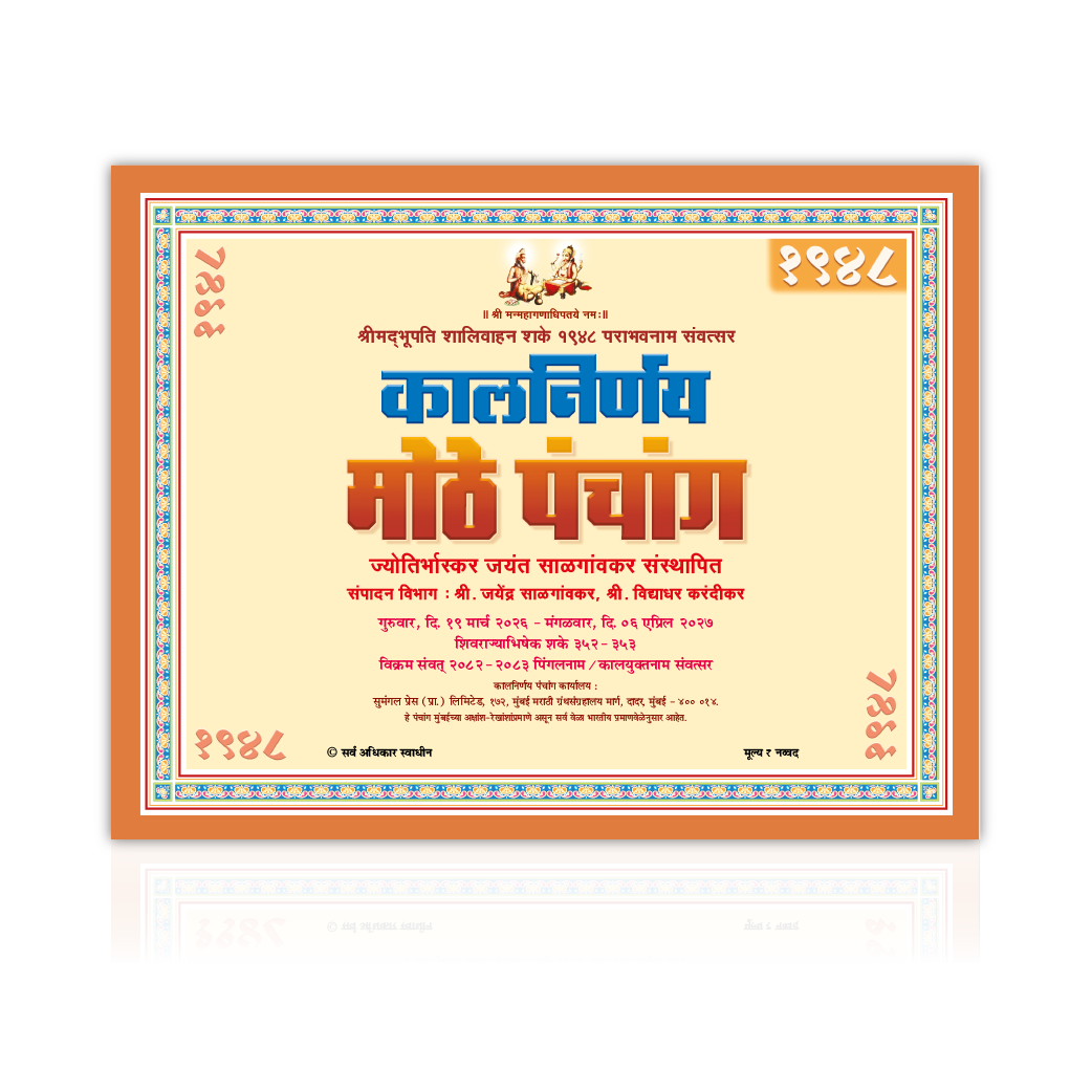 KALNIRNAY Mothe Panchang 2026 gives you information about the entire year of Panchang. It is a detailed information provider of the various Muhurat’s & days of the Hindu Panchang from ‘Chaitra to Falgun‘. It is available only in the Marathi language.