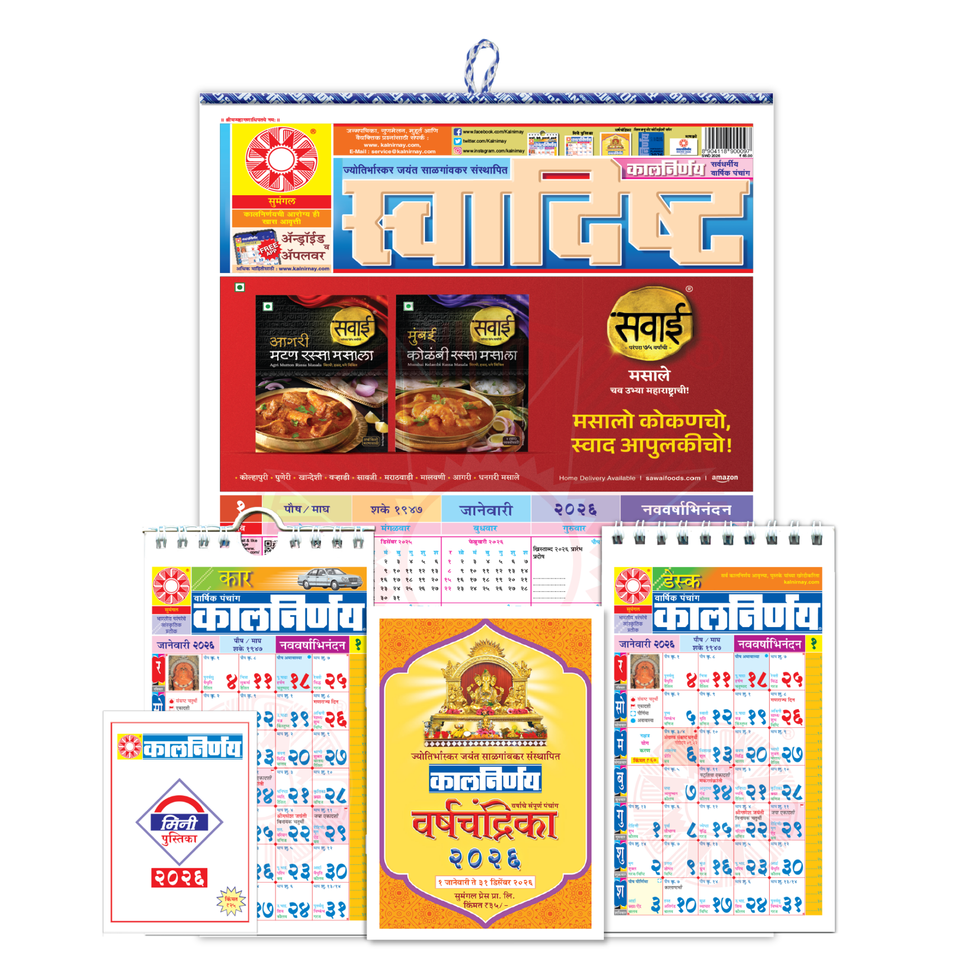 Kalnirnay Swadishta Combo Pack 2026 comprises a swadishta calmanac 2026 along with a car, desk edition, accordion and Varsha Chandrika (Mini Panchang) Marathi Edition.